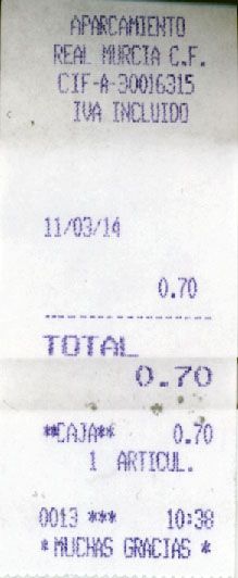 La concejal socialista Mar Rosa lamenta que el edil de Patrimonio, Cosme Ruiz, siga mintiendo a los murcianos con la explotación del parking municipal de Vieja Condomina que, a día de hoy -en contra de las afirmaciones hechas por Ruiz- sigue siendo explotado por el Real Murcia, tal y como demuestra el ticket que se adjunta con fecha de hoy.
