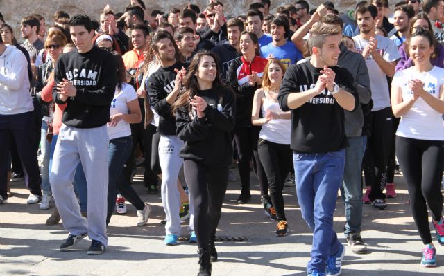 Los alumnos de la Facultad de Ciencias de la Actividad Física y del Deporte de la UCAM han sorprendido a la comunidad universitaria este mediodía con la celebración de un flashmob al que se han sumado cientos de estudiantes. Se trata de la primera actividad desarrollada en el marco de la fiesta del Patrón de CAFD, San Rosendo, que se celebra entre hoy y mañana 12 de marzo.