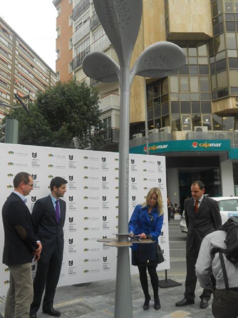 Este nuevo mobiliario urbano, que el primero de estas características de toda Europa, permite la carga de seis dispositivos de todo tipo, funciona con placas solares y está dotado de tecnología LED. Además ha sido diseñada especialmente para Murcia y está realizada de forma artesanal
