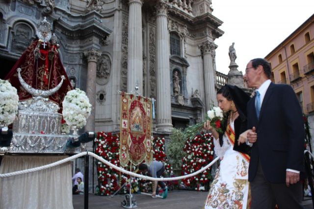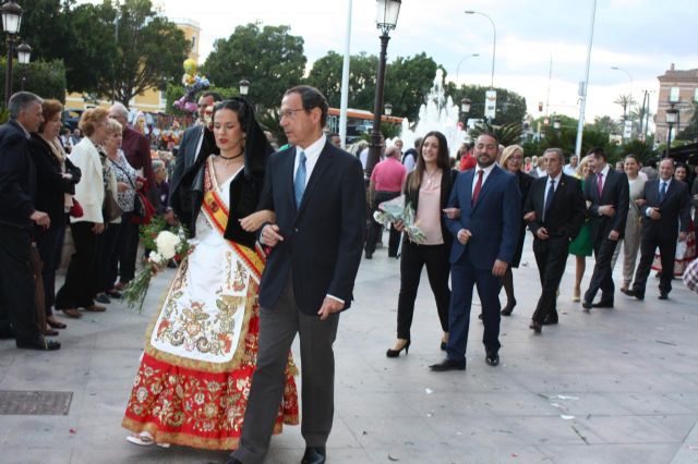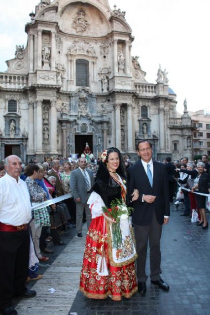 El Alcalde, acompañado por miembros de la Corporación, participa junto a las Reinas de la Huerta y peñas en la ofrenda floral a la Virgen de la Fuensanta. El cortejo partió de La Glorieta hacia la Plaza Belluga.