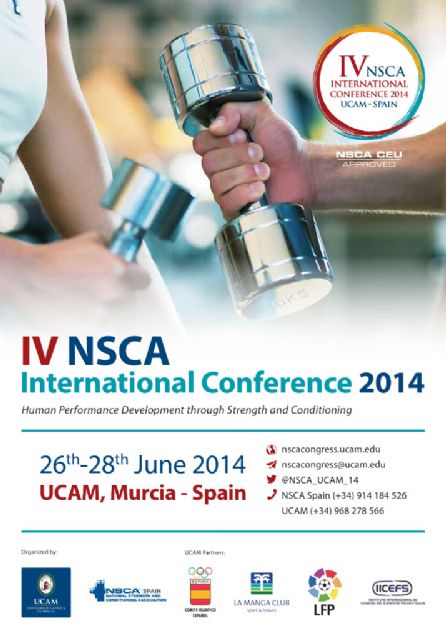 La Universidad Católica San Antonio de Murcia (UCAM) y la 'National Strength and Conditioning Association' (NSCA) organizan el 'IV NSCA International Conference' (IV Congreso Mundial de la NSCA) del 26 al 28 de junio. El congreso reunirá a más de 500 especialistas y profesionales en Fuerza y Acondicionamiento Físico que llegarán de más de 38 países, tan diversos como Japón, Brasil, Indonesia, Israel, Chile o Canadá. El campus del Monasterio de Los Jerónimos, el UCAM Sports Center y La Manga Club serán las tres sedes principales en las que se realizarán las conferencias y los talleres.