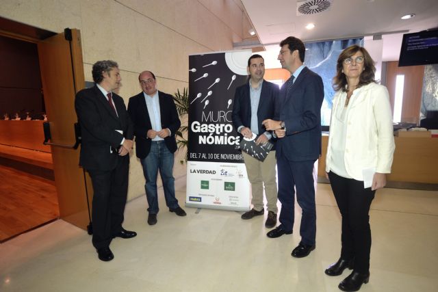 Del 7 al 10 de noviembre, el Auditorio y Centro de Congresos Víctor Villegas de Murcia será el punto de encuentro de los profesionales y las primeras marcas de hostelería con los aficionados a la gastronomía. Así lo han dado a conocer el director de 'La Verdad', Alberto Aguirre de Cárcer; el director del congreso, Sergio Gallego; el consejero de Industria, Turismo, Empresa e Innovación, Juan Carlos Ruiz y el consejero de Educación, Cultura y Universidades, Pedro Antonio Sánchez en la presentación de Murcia Gastronómica, celebrada en el Centro de Cualificación Turística de Murcia.