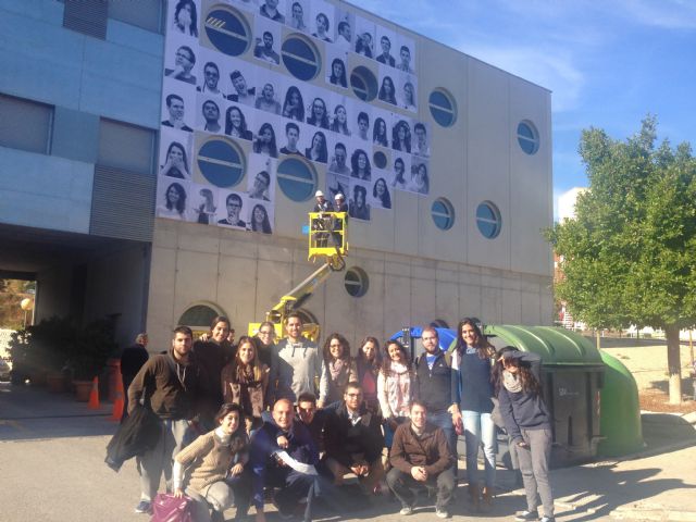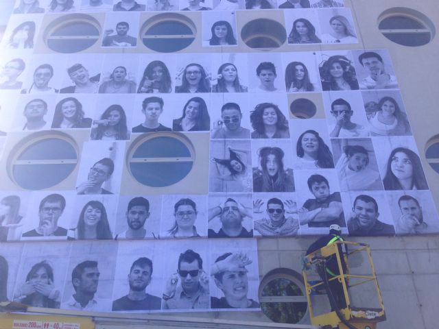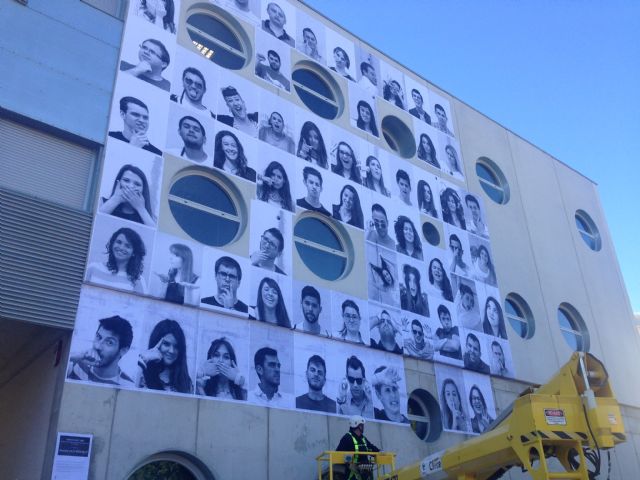 Alumnos de la Facultad de Educación de la Universidad de Murcia, coordinados por la profesora Laura Boj, han montado en la fachada del centro la instalación fotográfica "La suma de individualidades para una educación rica y plural".