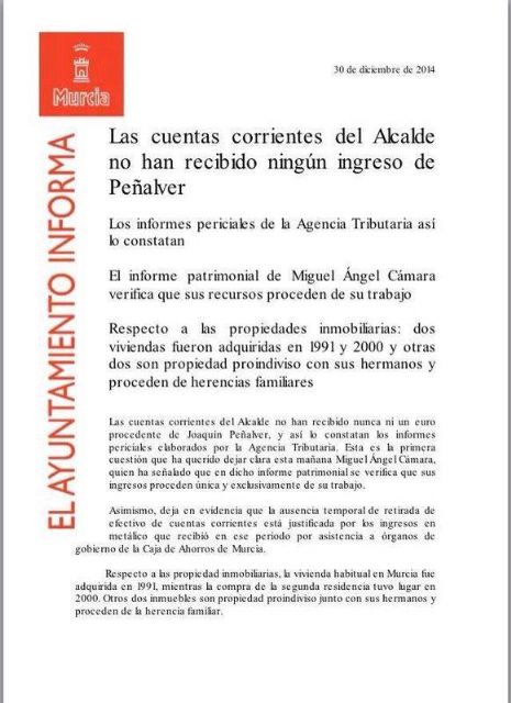 El Sr. Cámara está usando descaradamente su posición de fuerza al frente del Ayuntamiento de Murcia para defender una situación personal, que es del todo indefendible. Nos parece fuera de lugar que la web municipal del Ayuntamiento de Murcia pagada por los impuestos de todos los ciudadanos de Murcia, se utilice por parte del Alcalde para defenderse de los problemas judiciales que tiene, fruto de un caso, cada vez más evidente, de presunta corrupción política.