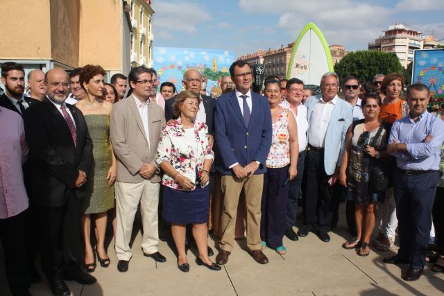 El Alcalde, José Ballesta, acompañado por el Concejal de Empleo, Turismo y Cultura, Jesús Pacheco, ha presentado esta mañana a los pregoneros de la Feria de Murcia 2015, los Parrandboleros, y a la autora del cartel anunciador, la artista murciana María del Carmen Artigas. El acto ha contado también con la asistencia de concejales del Equipo de Gobierno y de los portavoces de los grupos municipales de PSOE y Cambiemos Murcia, José Ignacio Gras y José Ignacio Tornel, así como representantes de las asociaciones y entidades festeras y patrocinadores.