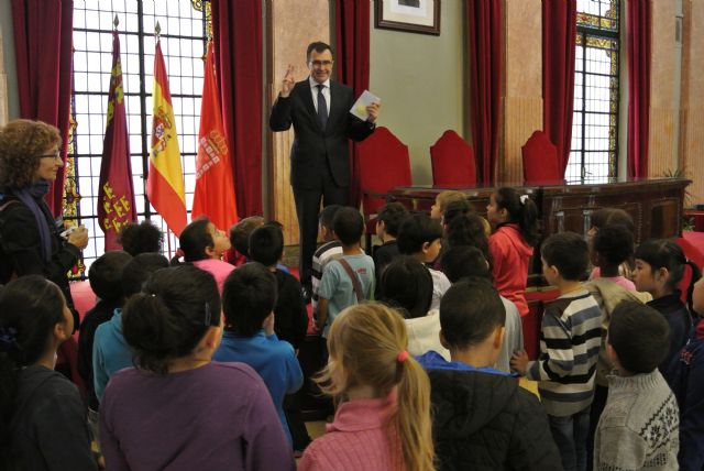 El Alcalde, José Ballesta, ha sido esta mañana guía de excepción de un grupo de alumnos de primero y segundo de primaria del colegio Ciudad de Murcia con quienes se encontró en la Glorieta, y a quienes acompañó hasta el Salón de Plenos.