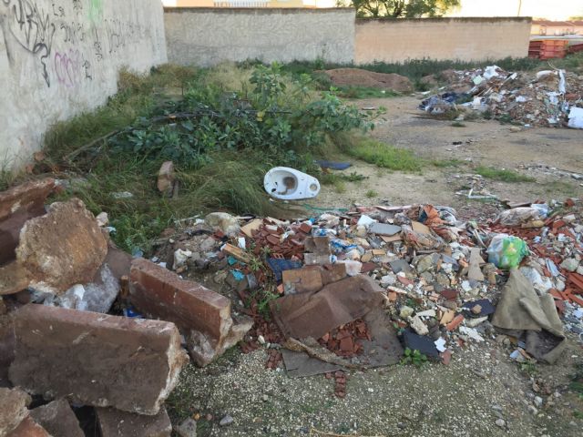 Los vocales del PSOE en la Junta Municipal de Sangonera la Verde, Francisco Noguera, Estela Rodado y Antonio Benito, han denunciado este miércoles la pasividad del Ayuntamiento de Murcia ante el problema creciente de acumulación de basura y escombros en solares entre la calle de las Parras y la calle Muñoz.