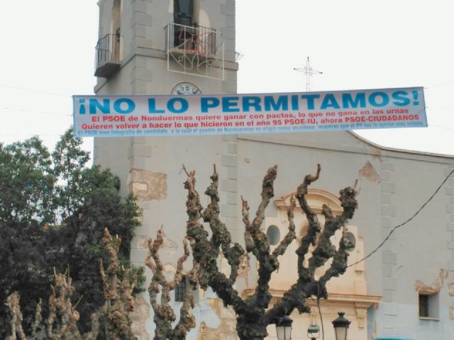 La pancarta está situada en la puerta de la Iglesia de Nonduermas e invita a la resistencia para impedir que se celebre la moción de censura que han firmado los vocales del PSOE y Ciudadanos de esta pedanía, en la que el Partido Socialista y el Partido Popular obtuvieron 4 vocales cada uno, mientras que Ciudadanos consiguió un representante.