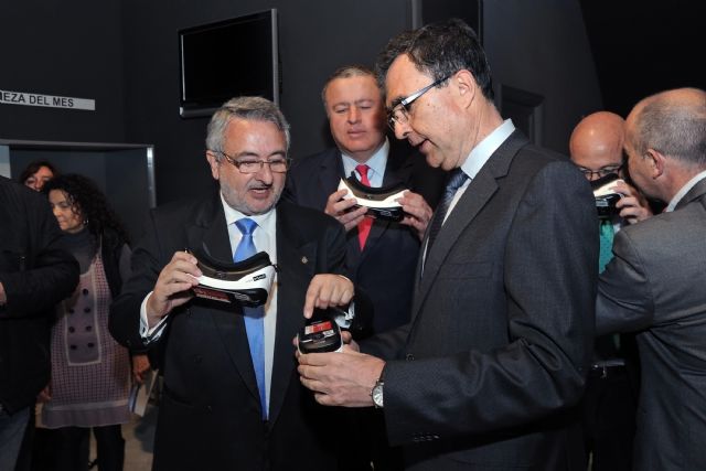 El alcalde de Murcia, José Ballesta, el consejero de Fomento e Infraestructuras, Francisco Bernabé, y el consejero de Desarrollo Económico, Turismo y Empleo, Juan Hernández, asistieron hoy a la presentación del vídeo realizado por el Colegio de Ingenieros Industriales de la Región de Murcia y que, mediante realidad virtual, muestra la llegada soterrada del AVE a la capital de la Región.