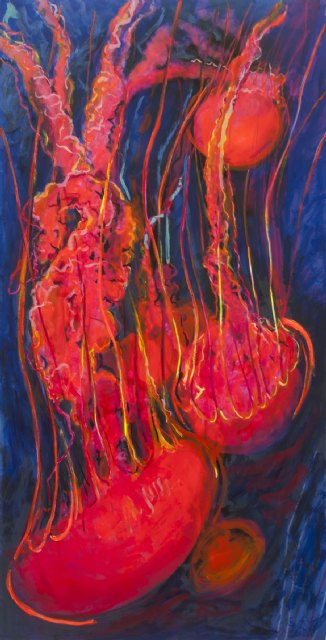 La exposición se ha adaptado al requerimiento de la iglesia de San Antonio (Murcia), que cuenta con espacios altos y sobre cuyas paredes, los artistas de MUHER han seleccionado varias piezas de gran formato (3x2 metros) que muestran un paisaje natural onírico. Como colofón, se ha creado una fascinante instalación acuática para la ocasión, que recordará la necesidad de la limpieza del agua en nuestra región, con proyecciónes y un mural en tres dimensiones con fondos marinos de medusas, parte importante de nuestro ecosistema en tanto que filtran los mares.