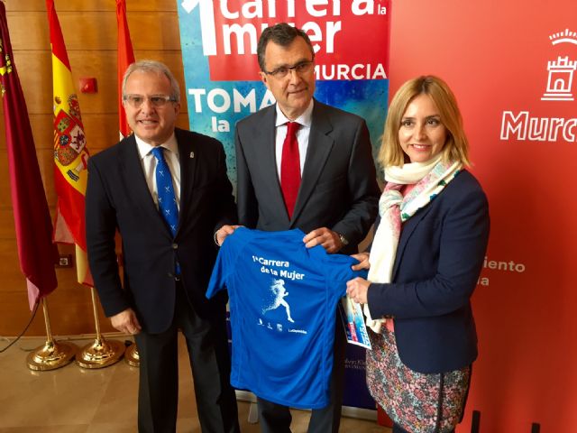 El alcalde de Murcia, José Ballesta, acompañado del concejal de Deportes y Salud, Felipe Coello; la concejala de Bienestar Social, Conchita Ruiz; la directora general de Mujer, Alicia Barquero; el presidente de la Federación de Atletismo de la Región de Murcia, Juan Manuel Molina; la vicepresidenta de la misma, Pruden Guerrero; y la adjunta a la Dirección General de Gestión de La Opinión, Paloma Reverte, han presentado esta mañana la primera edición de la Carrera de la Mujer en Murcia, que contará con 5.000 participantes y se disputará el próximo domingo, día 10 de abril, a partir de las 10.00 horas.