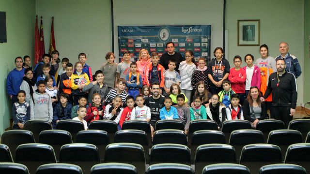 Los alumnos y alumnas del Colegio Pintor Pedro Flores, de Murcia, han compartido la mañana de entrenamientos con los jugadores de la primera plantilla del UCAM Murcia CB.
