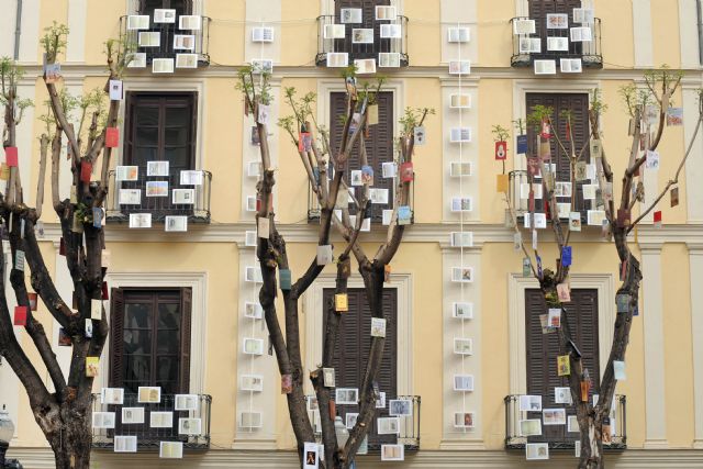 El montaje, que se podrá ver durante toda la semana, consiste en portadas de El Quijote de distintas épocas, cedidas por el coleccionista Diego García López, quecuelgan de los árboles de la plaza a modo de hojas y de distintos retratos de su autor, Miguel de Cervantes.