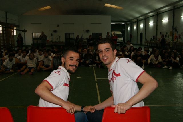Los jugadores de ElPozo Murcia FS, el guardameta Fabio y el ala-pívot Juampi, visitaron esta mañana a los escolares de Secundaria del Colegio San José, al quedarse en Murcia para recuperarse de sus respectivas lesiones y estar a tope el próximo sábado en la Final de la Copa de S.M El Rey en Sevilla.