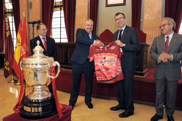 El alcalde de Murcia, José Ballesta, y miembros de la Corporación municipal de todos los grupos políticos, recibieron hoy en el Salón de Plenos del Ayuntamiento a los jugadores del equipo murciano ElPozo, flamantes campeones de la Copa del Rey de Fútbol Sala disputada este pasado fin de semana en Sevilla.
