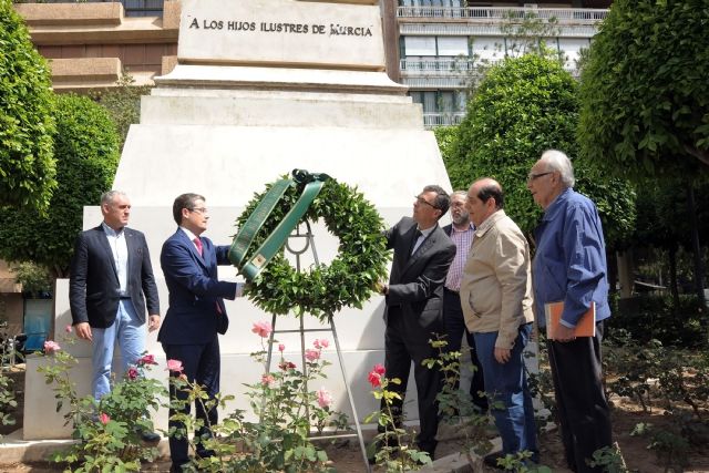 El alcalde de Murcia y el director del Museo Ramón Gaya, Manolo Fernández Delgado, realizaron también la ofrenda de una corona de laurel a los Hijos Ilustres de Murcia, en la Plaza de Santa Isabel, bajo la escultura con la alegoría de La Fama, que les rinde homenaje.