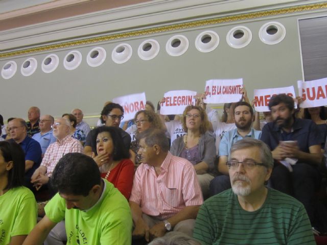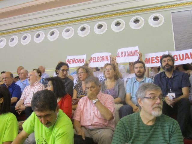 Las concejalas de Ahora Murcia han cambiado hoy sus asientos en el Pleno, durante las mociones defendidas por el PP, por las bancadas de las pajareras junto a los ciudadanos, "en espera a que el alcalde diera su respuesta al papel que concede al trabajo de los grupos de la oposición y a las mociones que éstos presentan". En una sesión marcada por la ausencia de mociones por parte de las formaciones de la oposición, en protesta por un informe del secretario del Pleno que señala que las mociones son meras proposiciones, y por las reivindicaciones de varios colectivos desde las pajareras, la portavoz de Ahora Murcia, Alicia Morales, ha respondido con dureza a la réplica que Ballesta ha dado a la pregunta planteada por la oposición acerca del informe realizado por el secretario del Pleno.