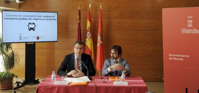 El alcalde de Murcia, José Ballesta y el consejero de Fomento e Infraestructuras, Pedro Rivera, firmaron hoy el convenio de colaboración entre el Ayuntamiento y la Comunidad destinado a mejorar el transporte público de viajeros en el término municipal de Murcia, que permitirá mejorar la conexión en autobús en las pedanías de la Costera Sur, beneficiendo a cerca de 100.000 vecinos del municipio.