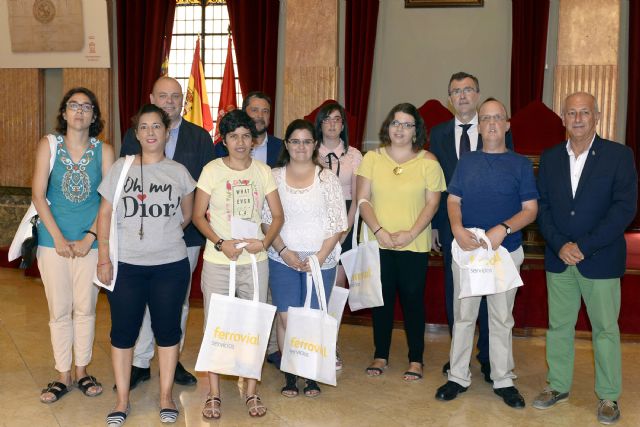 El alcalde de Murcia, José Ballesta, acompañado por lel concejal de Fomento, Roque Ortiz, el presidente de Fundown, Diego González, y el gerente de Administraciones Locales de Ferrovial, Antonio Luna, recibió hoy a los jóvenes con síndrome de Down que finalizan hoy sus prácticas en la 'Escuela de Oficios' de Ferrovial Servicios, tras haber recibido formación teórica y práctica a lo largo de los dos últimos meses en instalaciones municipales.