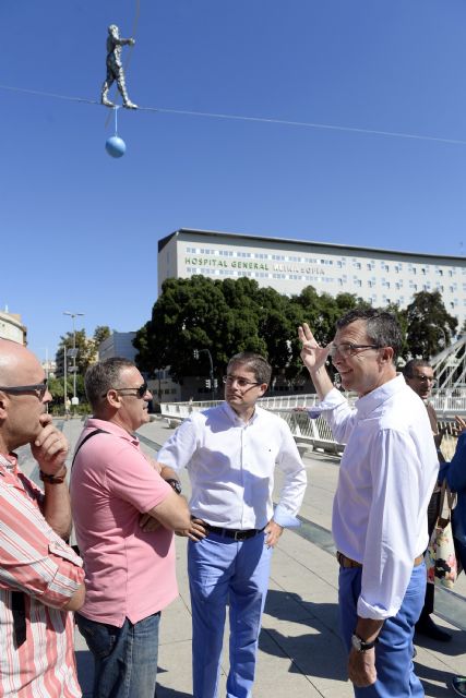 El alcalde de Murcia, José Ballesta, acompañado por miembros del equipo de Gobierno, visitó hoy las esculturas efímeras que ya decoran los puentes de la ciudad, y que se incrementarán hasta 14 en los próximos días, desde la pasarela Manterola hasta La Fica.