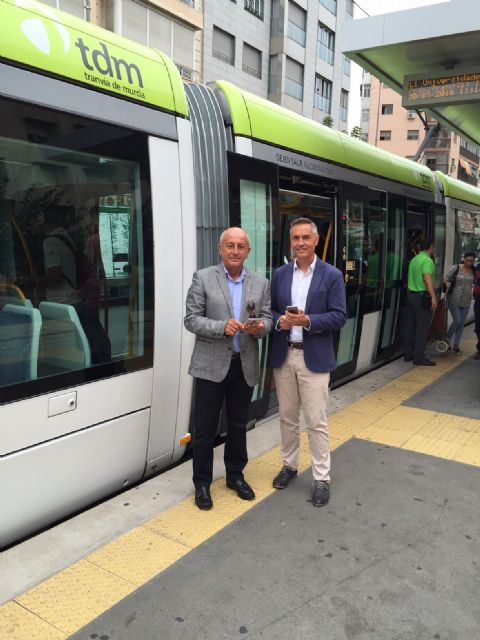 El concejal de Fomento, Roque Ortiz, y el gerente de Tranvía de Murcia, Severiano Arias, han visitado esta mañana un tranvía en el que ya se puede navegar por internet a través de wifi de forma totalmente gratuita.