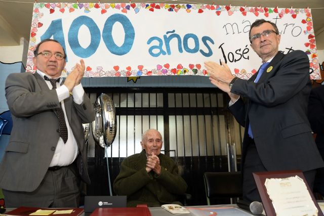 Los alumnos rindieron un cariñoso homenaje a este maestro incansable, Medalla de Oro al Mérito en el Trabajo –concedida por el Gobierno de España en 2007-, con la plantación de un ciprés y se agruparon para formar el número 100 con sus siluetas en el patio. La música la puso la Tuna de la Facultad de Educación de la Universidad de Murcia.