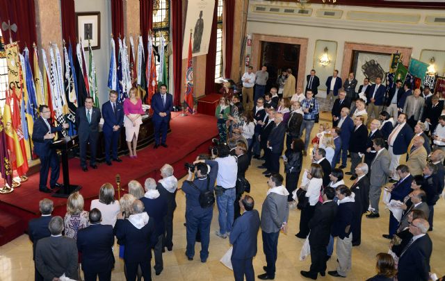 El alcalde de Murcia, José Ballesta, junto al concejal de Empleo, Turismo y Cultura, Jesús Pacheco, y miembros de la Corporación municipal, recibieron hoy en el salón de Plenos del Ayuntamiento al Gran Pez 2017, José María Martínez, y Doña Sardina 2017, María Pina, acompañados por el presidente de la Agrupación Sardinera, Gregorio González.
