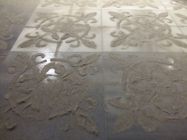 La intención es que este fino polvo, que tiene la forma de delicados arabescos, se desdibuje definitivamente cuando la gente pase sobre él. "Me gusta pensar que ese polvo que va a quedar impregnado en las suelas de los zapatos de la gente cuando pise esta instalación, es una metáfora de lo que ocurre en la actualidad: está entre nosotros, lo arrastramos, pero no le hacemos el menor caso". "Todo el trabajo concluye- versa sobre la Memoria Histórica".