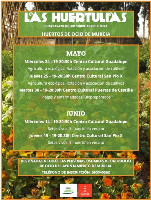 Mientras que el día 30, en el Centro Cultural Puertas de Castilla, se tratará sobre plagas, enfermedades y biopreparados. En el mes de junio se realizarán dos sesiones más sobre setos vivos y los cuidados del huerto en verano, una el día 14 en el Centro Cultural de Guadalupe y otra en el día 14 en el Centro Cultural de San Pío X.