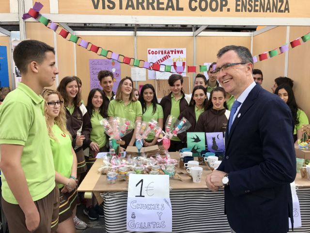 José Ballesta inaugura la I Muestra de Cooperativas Escolares que organiza UCOERM. Manualidades y gastronomía, así como batucadas y hasta un 'rap científico' han contribuido a impulsar valores como el emprendimiento y el trabajo en equipo desde la escuela.