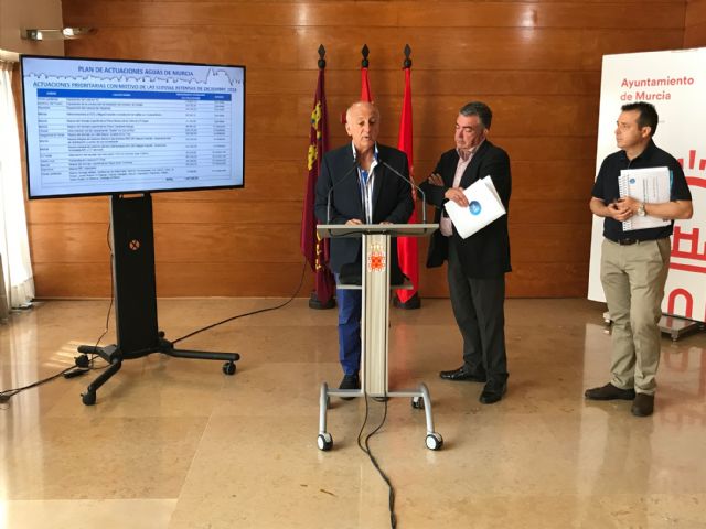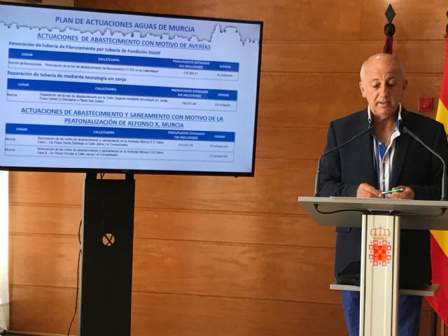 El concejal de Fomento, Roque Ortiz, y el gerente de Aguas de Murcia, José Albaladejo, han presentado el programa, que incluye 85 obras y cuenta con un presupuesto global de 10.446.189 euros, y su desarrollo supondrá la intervención sobre 13 kilómetros de redes de abastecimiento, 10 kilómetros de saneamiento y 750 metros de red de riego.