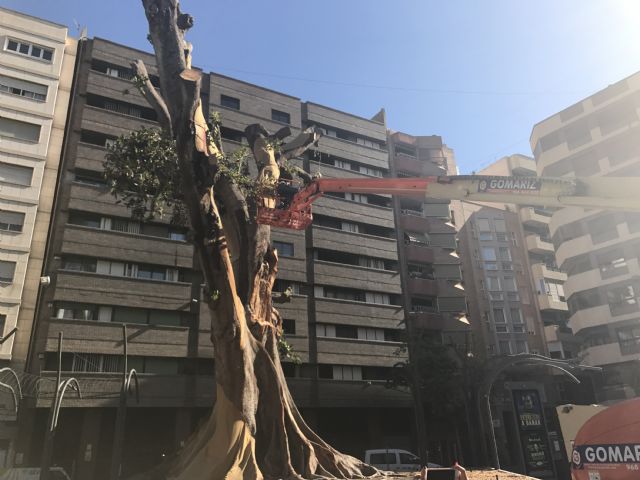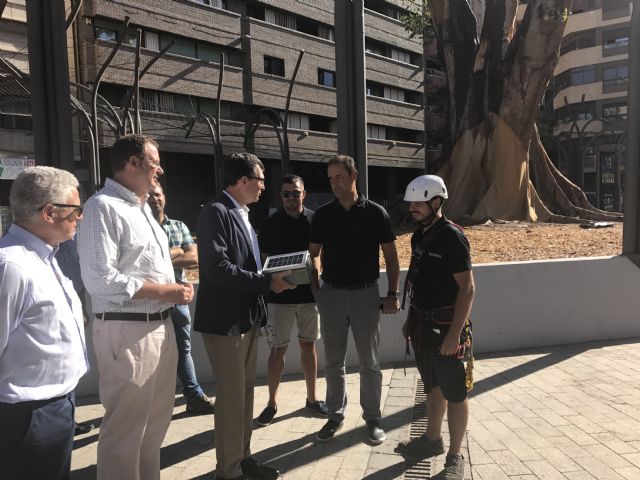 La Concejalía de Modernización de la Administración, Calidad Urbana y Participación, que dirige José Guillén, está instalando unos sensores en el ficus de la plaza de Santo Domingo y en los diez que se encuentran en el jardín de Floridablanca con el fin de monitorizar su estado en tiempo real y garantizar así la seguridad.