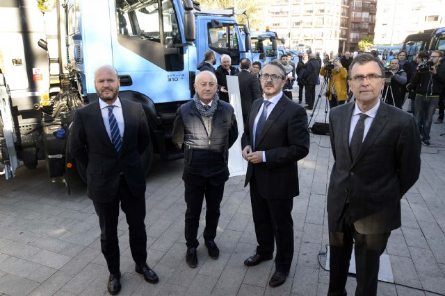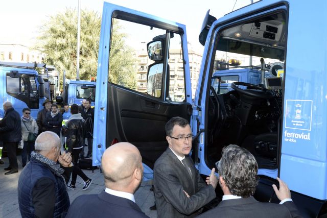 El alcalde de Murcia, José Ballesta, ha presentado esta mañana la nueva flota de vehículos y maquinaria que se incorpora a la limpieza viaria y recogida de residuos de Murcia. Con una inversión total  de 1.669.288€, la actual concesionaria, Ferrovial Servicios, añade 21 vehículos y máquinas que mejoran la calidad del servicio, añadiendo más eficiencia, seguridad y menos contaminación en el municipio.