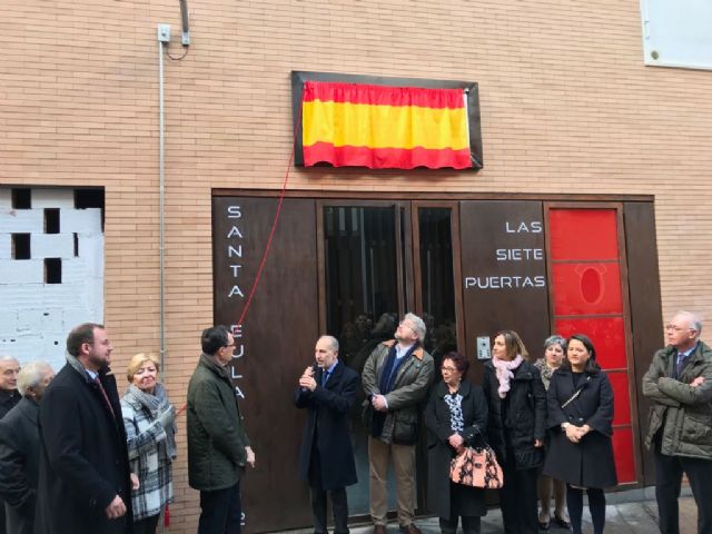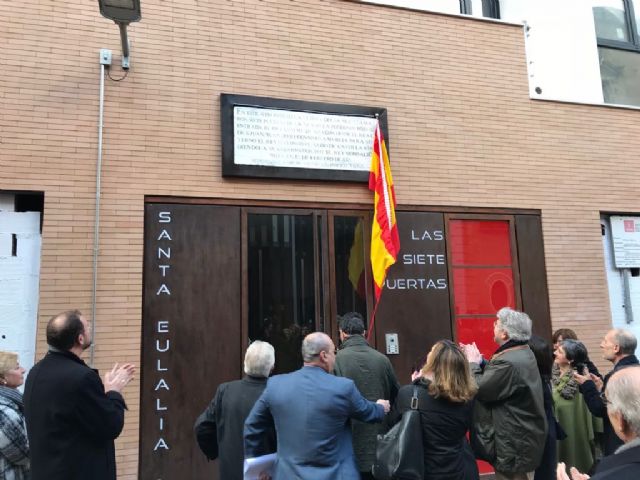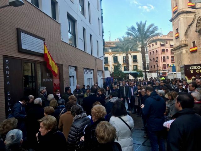 El alcalde de Murcia, José Ballesta, descubrió esta mañana en la Plaza de Santa Eulalia la placa del siglo XIX que conmemora la entrada de Jaime I ‘El Conquistador’ a la ciudad por la puerta de Santa Eulalia, con la que este barrio recupera parte de su patrimonio histórico gracias al proyecto ADN Urbano.