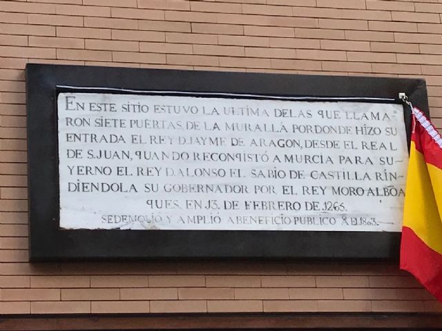Esta placa conmemora la entrada de Jaime I a Murcia en el año 1266 por esta puerta de la ciudad. Después del asedio, y tras la espera a las puertas de las murallas de Murcia de las tropas cristianas venidas desde el Reino de Aragón, los musulmanes murcianos cedieron.