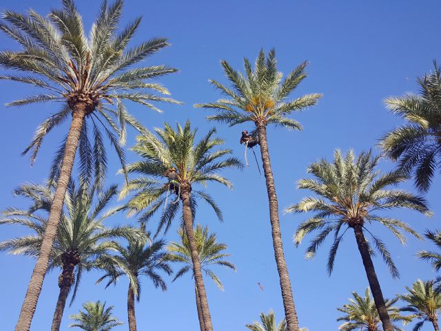 Con la llegada del verano comienza la poda de uno de los elementos más reseñables de las zonas verdes, las palmeras. Se van a eliminar las palmas secas, así como los frutos que puedan caer a la vía pública de 15.000 ejemplares repartidos entre la ciudad y pedanías.
