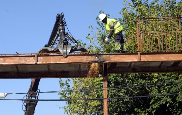 Esta mañana ha quedado como una página de la historia la última pasarela sobre el ferrocarril de la antigua línea de Chinchilla a Cartagena que estaba previsto demoler dentro del proyecto de construcción de la Senda Verde. Se trata de la estructura existente en San José de la Vega, cuyo armazón de acero quedará desmantelado esta semana.