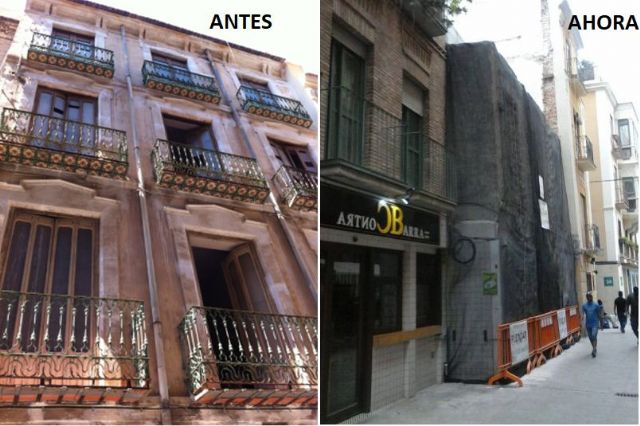 La Plataforma por la Defensa del Patrimonio Cultural de Murcia ha mostrado su pesar ante el derribo de una vivienda tradicional en las proximidades de la plaza de las Flores, en la calle Jiménez Baeza de la capital. Edificio que poseía balcones con rejería y base de losa y en cuyos bajos se encontraba la antigua librería Rubio, formando un conjunto de interés con otros inmuebles del entorno.
