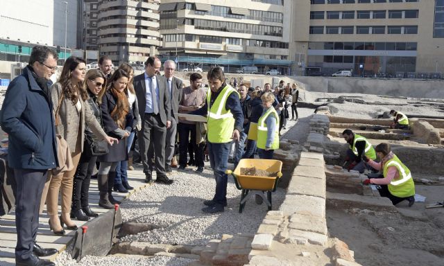 El alcalde de Murcia, José Ballesta, junto a miembros de la Corporación municipal, representantes de la Universidad de Murcia y el director general de Bienes Culturales, Juan Antonio Lorca, visitaron hoy el yacimiento de San Esteban, mientras el equipo de arqueólogos liderado por el profesor Jorge Eiroa continúa realizando nuevos avances en las excavaciones que están sacando a la luz valiosos hallazgos en el ‘funduk’ (el hospedaje), el cementerio y el oratorio.
