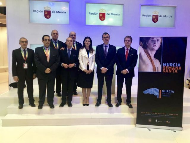 El alcalde de Murcia, José Ballesta, junto al concejal de Promoción Económica, Cultura y Programas Europeos, Jesús Pacheco, y el presidente del Cabildo Superior de Cofradías, Ramón Sánchez-Parra, presentaron hoy en FITUR la nueva marca turística de la Semana Santa de Murcia; un acontecimiento de Interés Turístico Internacional, que el año pasado alcanzó picos de ocupación del 97% en los hoteles murcianos.