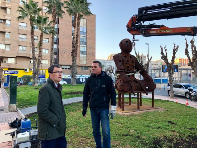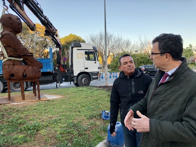 El alcalde de Murcia, José Ballesta, asistió esta mañana a la instalación de la escultura monumental de la serie ‘Guardianes’, creada por el artista de proyección internacional Xavier Mascaró, que custodia desde hoy la entrada a la ciudad de Murcia desde la céntrica avenida Juan Carlos I.