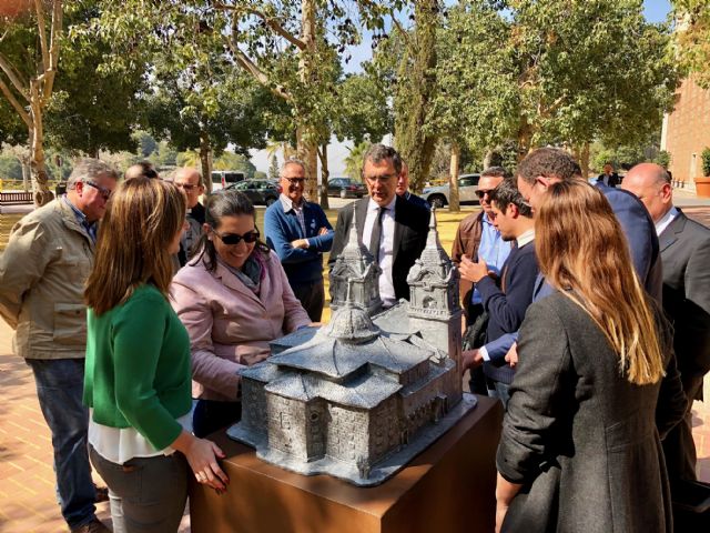 El alcalde de Murcia, José Ballesta, junto a los concejales de Modernización de la Administración y Desarrollo Urbano, José Guillén, y de Derechos Sociales y Cooperación al Desarrollo, Conchita Ruiz, supervisaron hoy la instalación de las reproducciones a escala del Santuario de la Fuensanta y La Catedral, las dos primeras obras de arte inclusivas que integran el museo tiflológico de Murcia, que ofrece a las personas invidentes y con discapacidad visual la oportunidad de descubrir estos espacios monumentales, a través del tacto.