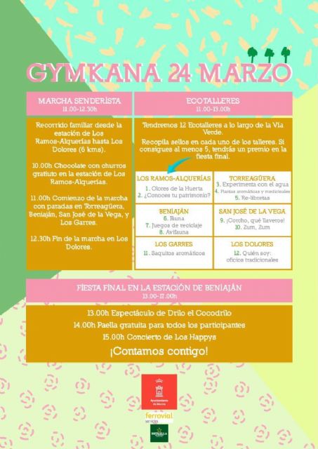 12 Ecotalleres serán los protagonistas de la Gran Yincana por la Vía Verde de la Costera Sur que tendrá lugar el domingo. La temáticas elegidas son Olores de la Huerta, ¿Conoces tu patrimonio?, situados en Los Ramos. Experimenta con el agua, Plantas aromáticas y medicinales, Relibretas, ubicados en Torreagüera. Fauna, Juegos de reciclaje, Avifauna en Beniaján. Corcho, qué llaveros, Zum, zum, en San José de la Vega. Saquitos aromáticos en Los Garres. Quién soy: oficios tradicionales en Los Dolores.