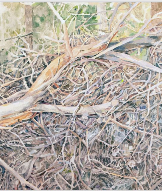 En la exhibición, comisariada por el grupo de innovación docente de la Universidad de Murcia (UMU) AEC (arte en construcción/Ecotono), la profesora de Pintura de la UMU Victoria Chezner explora una naturaleza en la que conviven las raíces viejas con un paisaje plagado de enredaderas.
