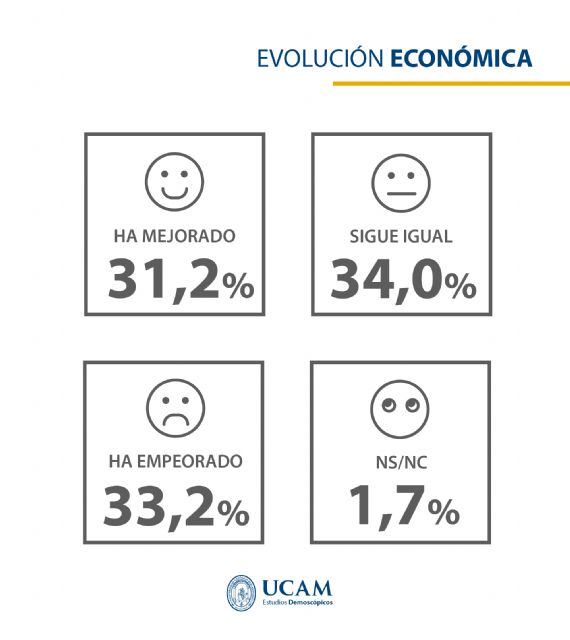 Se preguntó también sobre la evolución económica de la Región en los últimos años y el 34% de las personas encuestadas considera que sigue igual, frente a un 33,2% que estima que ha empeorado y un 31,2% que cree que ha mejorado.