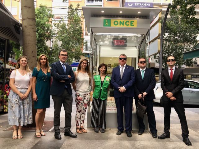 El alcalde de Murcia, José Ballesta, junto a la concejal de Derechos Sociales y Familia, Pilar Torres, la concejal de Mayores, Discapacidad y Cooperación al Desarrollo, Paqui Pérez, y el delegado territorial en Murcia de la Organización Nacional de Ciegos de España, Juan Carlos Morejón, asistió hoy a la inauguración del nuevo quiosco de la ONCE, un modelo de cabina renovado que se ha instalado en la Gran Vía, a la altura del nº23, y que supone una importante mejora funcional y comercial tanto para los vendedores como para el público, con un diseño que garantiza los requisitos de accesibilidad universal.