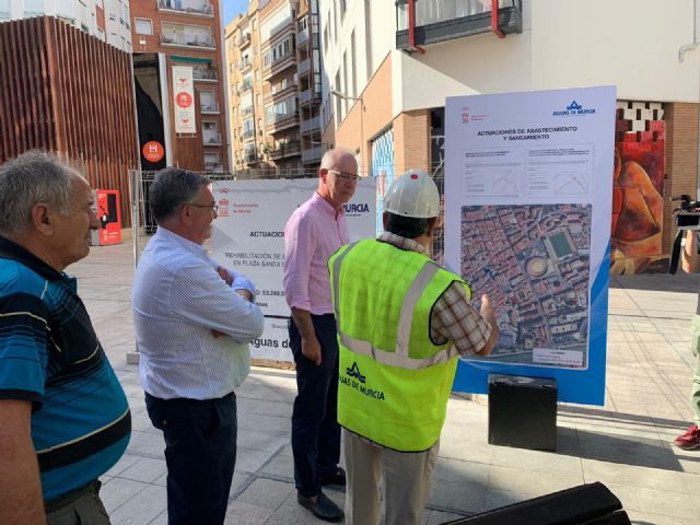 El concejal de Desarrollo Sostenible y Huerta, Antonio Navarro, acompañado por el gerente de Aguas de Murcia, José Albaladejo, ha visitado esta mañana las obras de renovación de la red de saneamiento existente en la plaza de Santa Eulalia.