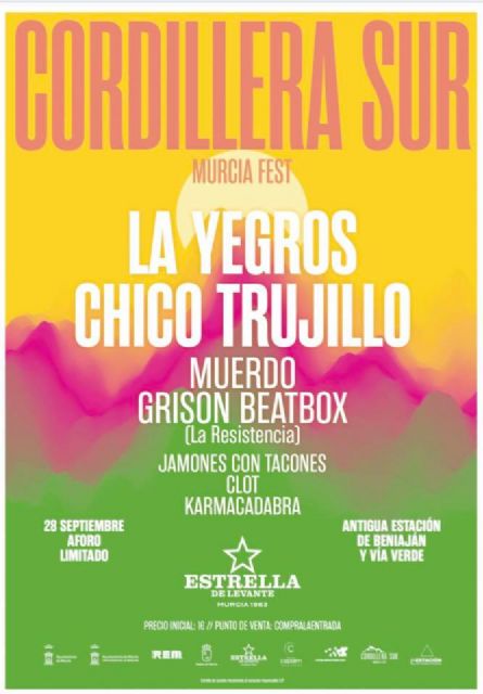 Avalado por el éxito de ediciones anteriores, el ya considerado como el evento musical juvenil por excelencia de la Cordillera, mantiene y refuerza el apoyo institucional recibido del Ayuntamiento de Murcia y la Comunidad Autónoma, de la Fundación Cepaim, Estrella de Levante y Sala REM. Tampoco ha faltado la colaboración de las instituciones de Beniaján y de la red local de comercios. La suma de esfuerzos ha dado como resultado una programación de actividades culturales, abiertas y gratuitas que tuvieron su pistoletazo de salida el pasado 21 de septiembre en la murciana Sala Revólver, con la FIESTA DE PRESENTACIÓN del festival, animada en esta ocasión por el ska de los italianos CaPaBrò. El punto culminante lo pondrá el gran concierto en La Estación del próximo día 28.