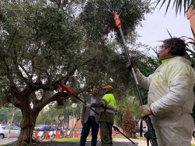 El Ayuntamiento de Murcia está llevando a cabo su campaña de recogida de aceitunas de los olivos municipales ubicados en los parques, jardines y medianas del municipio de Murcia.