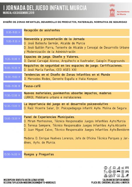 El consistorio organiza por primera vez en la ciudad el evento la I Jornada del Juego Infantil, que tendrá lugar el próximo 4 de diciembre en el Edificio Moneo. La jornada versará sobre las últimas tendencias en estos espacios lúdicos, proyectos, materiales y normativa de seguridad. "Las zonas infantiles son lugares en los que conviven diariamente personas de todas las edades y con distintas capacidades. Es por ello que su diseño es una prioridad para este consistorio, pues debemos confeccionar espacios sin barreras, adaptados a todos, lugares seguros y que promuevan la integración de todos los ciudadanos", explica José Guillén.